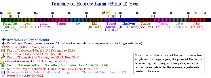 Provided here is a simplified timeline of the Hebrew months, and the various ceremonies that were performed at appointed times. We will consider each of these in terms of both the associated rituals, and their symbolic meanings.